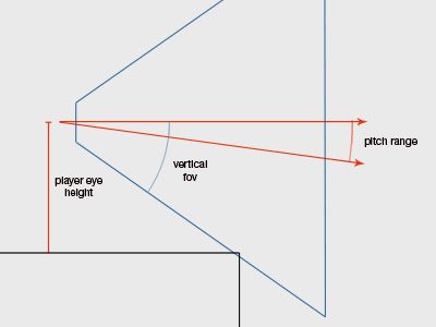 Some players will naturally look down as they approach a jump, which means they’ll be able to get much closer before losing sight of it. A player who leaves their view flat will have less distance, and players who happen to be looking up will find themselves with significantly less distance! Below is a quick diagram I whipped up to show the relevant values that determine this player blind spot.